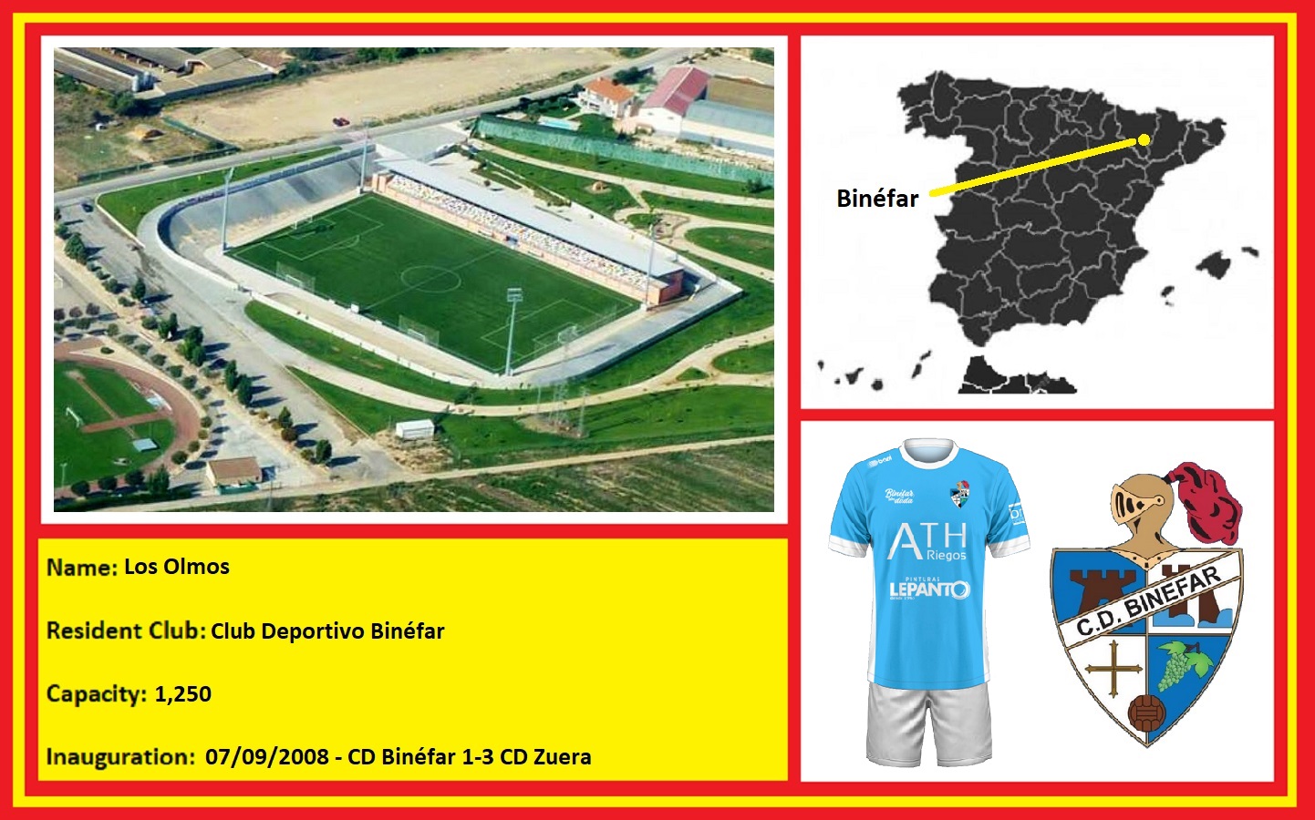 CD Binéfar played its first match at its new home, Los Olmos, on 7 September 2008, losing 1-3 to CD Zuera. Their poor form from the previous season followed them to their new home, and a miserable season ended with the club dropping to the Aragón Regional Preferente for the first time in over 30 years. They returned to the Tercera at the first attempt, and apart from another season-long stay in the Regional Preferente in the 2014-15 season, they remained in the Tercera until the Spanish Leagues were restructured in the summer of 2021. Decent form in the truncated league structure saw CD Binéfar reach the playoff semi-finals for a place in the new Segunda Federación. However, a 3-2 defeat to SD Huesca B saw the club consigned to the Tercera Federación for the 2021-22 season. CD Binéfar returned to the playoffs a year later but was unable to overcome the challenge of CF Illueca.