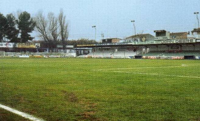 El Segalar was situated on the north-western edge of town, close to the main railway line that links Huesca to Lleida. It played host to the club’s most successful era, when, over a 21-year period, it spent 13 seasons in Segunda B. CD Binéfar recorded four top-ten finishes during that period, with a best position of 7th in the 1983-84 season. The club’s last season in the third tier came at the end of the 2002-03 season, when they finished bottom of Grupo II, some 21 points from safety. El Segalar remained home until 2008, and had become encircled by housing and the town’s sports pavilion & swimming pool. The ground featured a full-length stand of six rows of green & white seats on its western side, a shallow covered terrace at the northern end which backed onto Calle Ordesa, and a fairly substantial open terrace at the southern end. There was just a thin strip of hard standing on the east side due to the proximity of the municipal sports pavilion. CD Binéfar played its last match at El Segalar on 15 May 2008, beating Figueruelas 2-1 to avoid relegation from the Tercera. Today, the pitch is parkland, yet the old southern terrace and the raised floor of the stand, minus its roof, can still be seen.