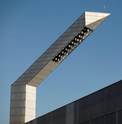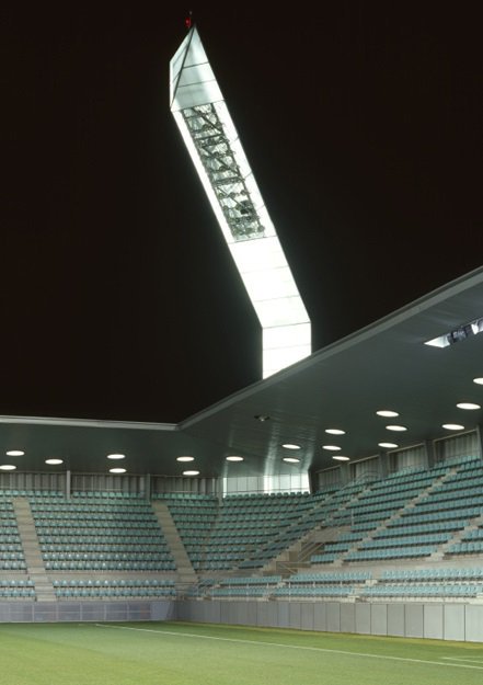 On 10th October 2006, the Spanish Under-21 side played Italy U-21’s in the first match at the Estadio Nueva Balastera. Regrettably, the chief driving force behind the new development, former director Alberto de la Corte López had died in 2002, but I am sure he would have been impressed with what was unveiled. Designed by Navarrese architect Patxi Mangado, the Nueva Balastera is minimalist in design, with the principle focus being one of light. From its use of translucent sheeting on the exterior, to the recessed lighting and brilliant white finish on the underside of the roof, the stadium positively radiates. However, the stand out feature is undoubtedly the floodlights. Clad in the same pale grey translucent material as the body of the stadium, these four towers lean towards the pitch at an alarming angle. However, it is at night that the stadium comes into its own. Within the body of the floodlights translucent exterior are rows of bulbs that illuminate the entire pylon with a bright white light. Resembling four cranked lightsabers, this lifts the stadium above the ordinary and into the realms of functional art.