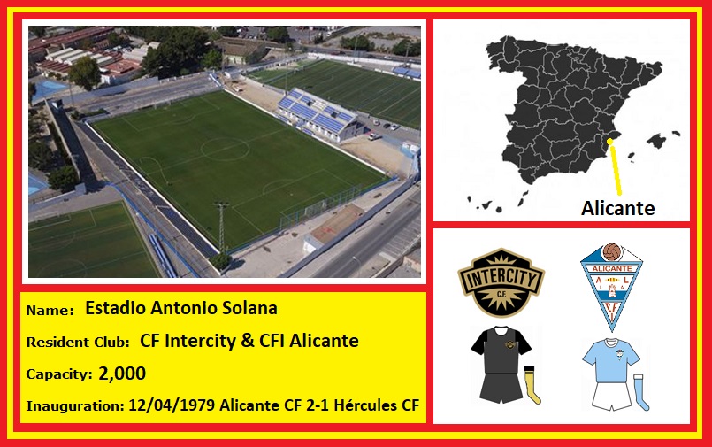 In June of 2015, the municipality closed the Ciudad Deportiva de Villafranqueza after serious structural defects were discovered in the main west terrace. This led to the demolition of the entire west side and in its place rose a 40-metre-long raised stand with a seating capacity of 500. Below the seated area are the main changing facilities. The south terrace has had much of its steps removed and replaced with hard standing, whilst the eastern side of the stadium still has the six rows of blue seats that were installed when Alicante CF returned to the stadium in 2011. The stadium was renamed the Estadio Antonio Solana after its 2015 makeover and has an overall capacity of 2,000, which is rarely if ever tested by either resident club. In 2023-24, both club’s had to play home matches away from Alicante, after the pitch became unplayable. CF Intercity played a few games at Orihuela, before new drainage and playing surface was installed. All of which begs the question, will the CF Intercity project continue in Alicante, or will the owners have their heads turned by another location?