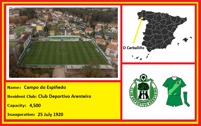 Club Deportivo Arenteiro hail from the city of O Carballiño, which lies around 15 miles northwest of the provincial capital of Ourense. Set in the Carballiño National Park and framed to the north by the Sierra del Faro, CD Arenteiro takes its name from the river that winds its way through the city. The club’s Campo do Espiñedo lies around 500 metres to the south of the Rio Arenteiro and has hosted the city’s football clubs since 1920.